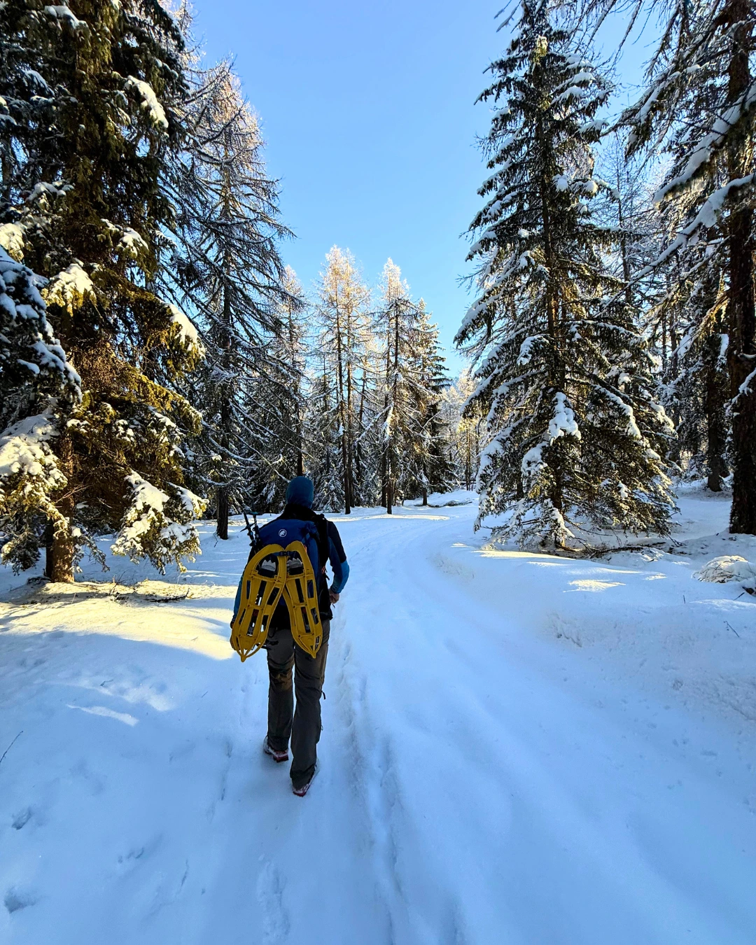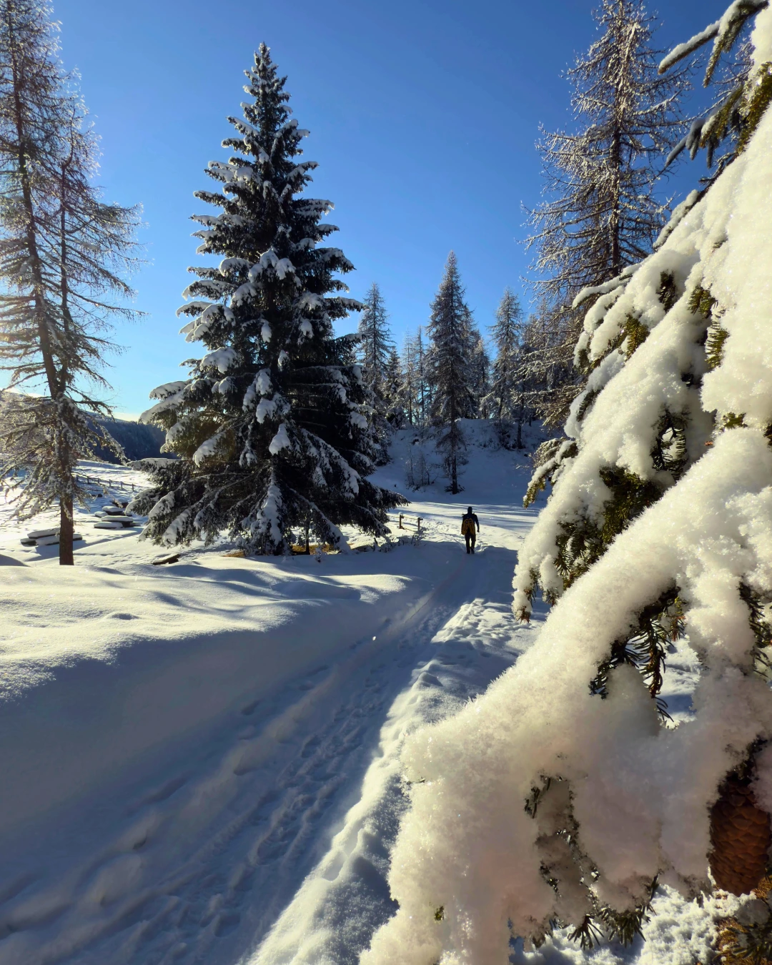Dal parcheggio estivo inizia la strada sterrata, sentiero numero 1, che risale verso il Col Pilaz. La prima parte è una delle più belle di tutto l’itinerario: si entra nel bosco di Pilaz, un tratto molto suggestivo, spesso silenzioso e “ovattato” dalla neve, dove la pendenza è regolare e permette di prendere il ritmo senza grossi strappi.
