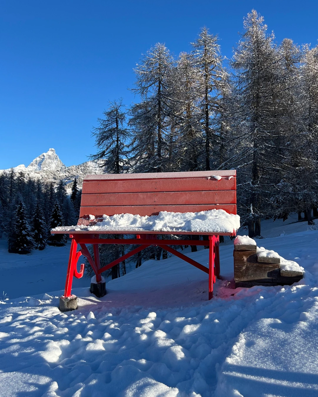 Si raggiunge così in circa 45 min il Col Pilaz [1954 m], ampia zona panoramica dove si trova anche la celebre panchina gigante con vista sul Cervino. Nei pressi del colle si può scorgere anche il Lago di Pilaz, ghiacciato in inverno e normalmente coperto dalla neve.