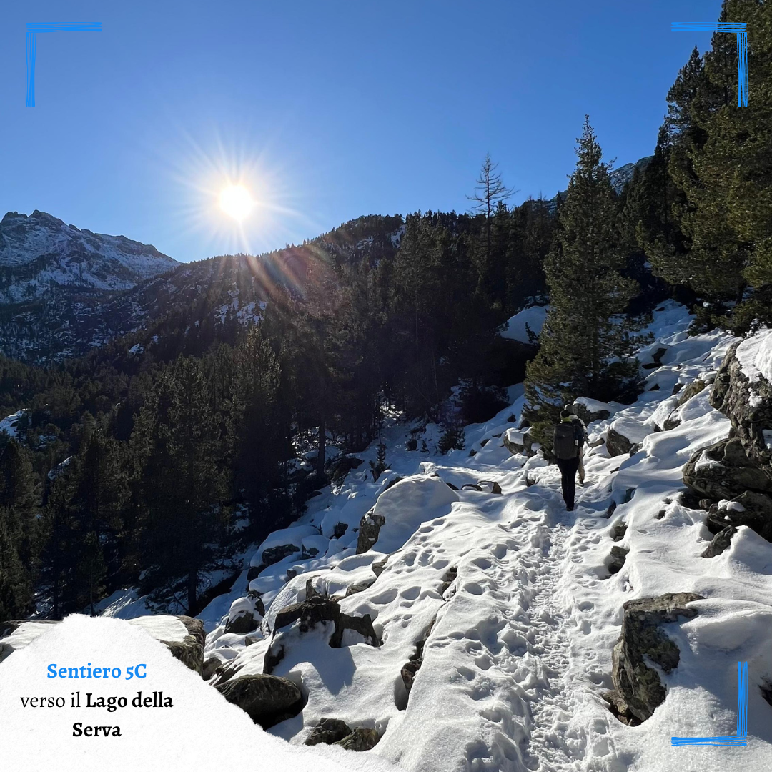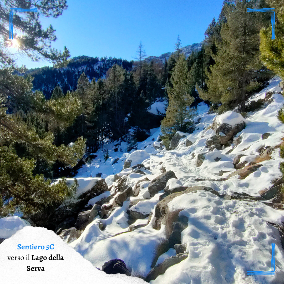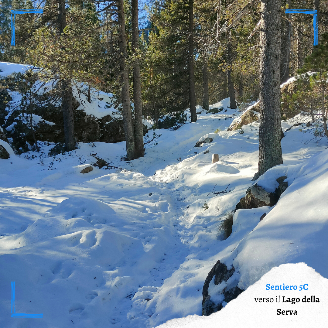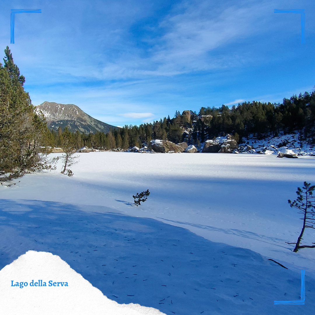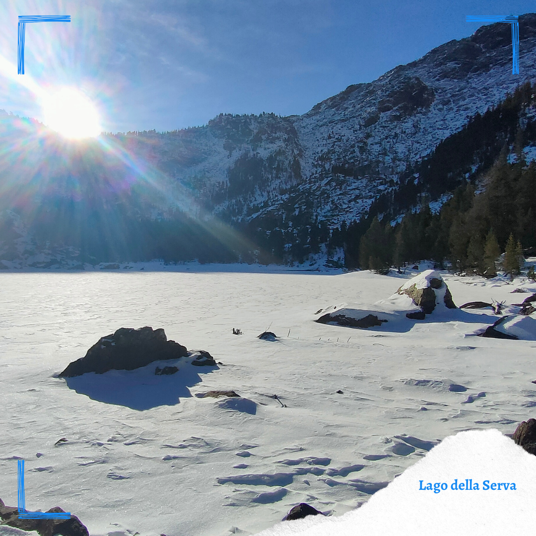 In circa un’ora e mezza di cammino, si raggiunge il Lago della Serva [1806 m], immerso in un paesaggio fiabesco. In questa stagione, il lago appare completamente ghiacciato e ricoperto dalla neve, regalando un’atmosfera unica.