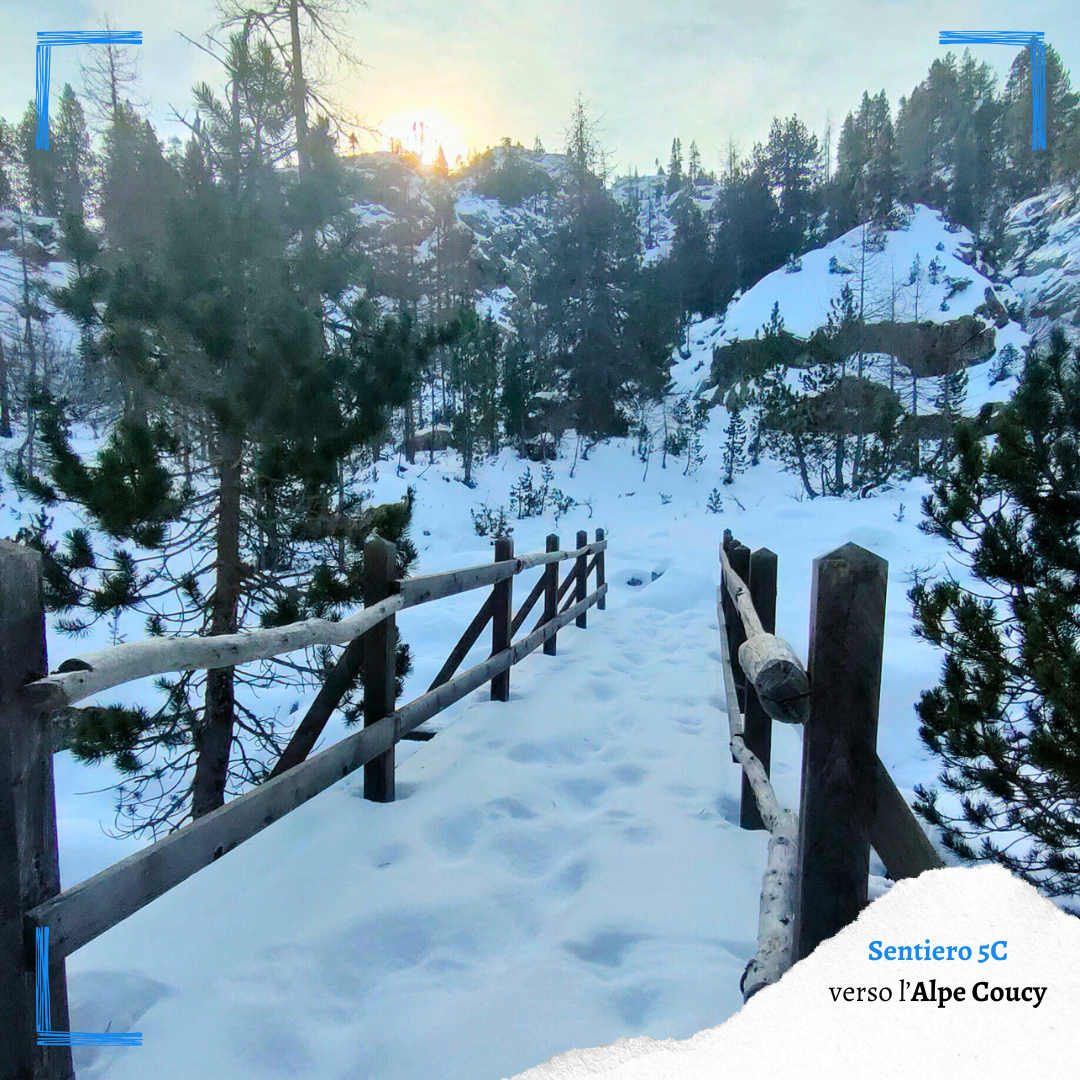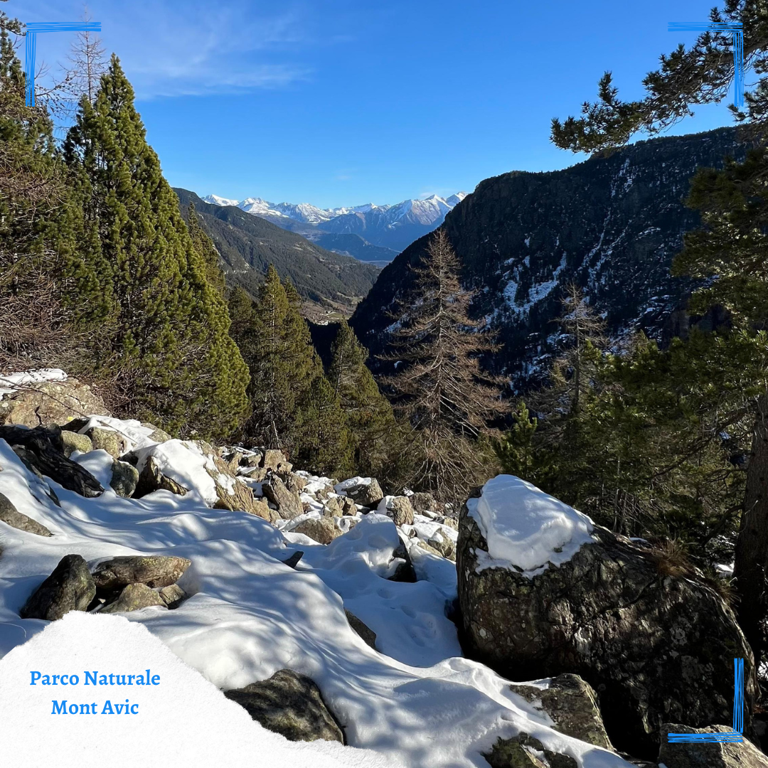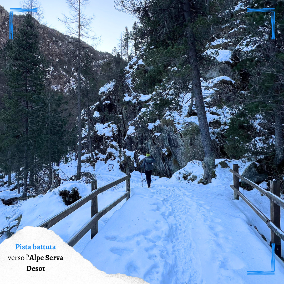 La prima parte del percorso si sviluppa lungo una larga pista battuta che sale dolcemente nel bosco, offrendo scorci sulle cime circostanti, tra cui la spettacolare vetta del Monte Avic, e sul fondo valle.