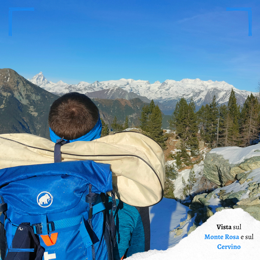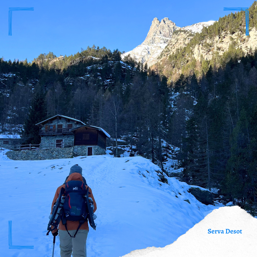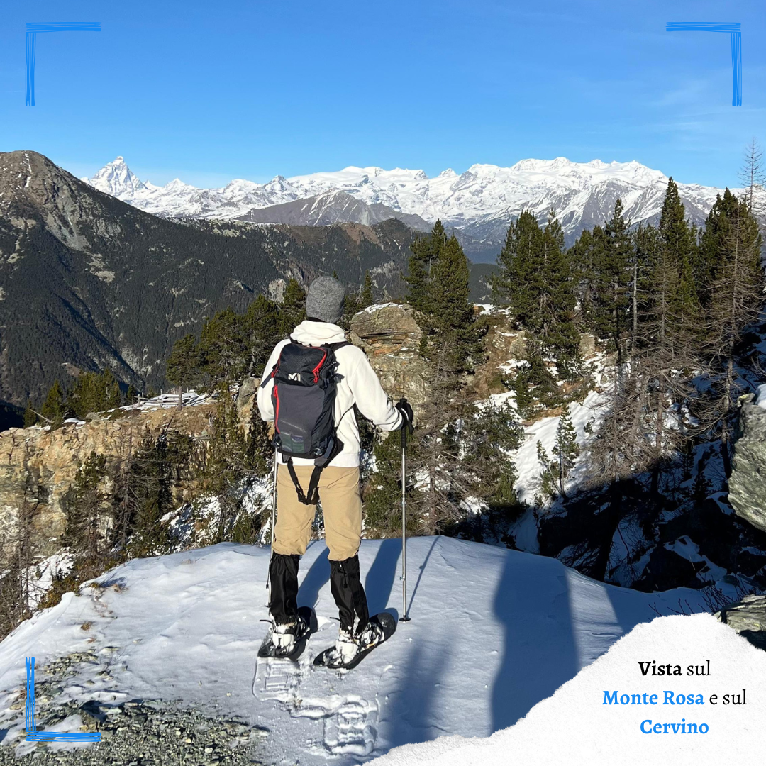 Ci si trova catapultati in un bosco innevato e silenzioso, lontano da piste battute, dove cascate ghiacciate e scorci sulle cime valdostane offrono continui sfondi per spettacolari fotografie.