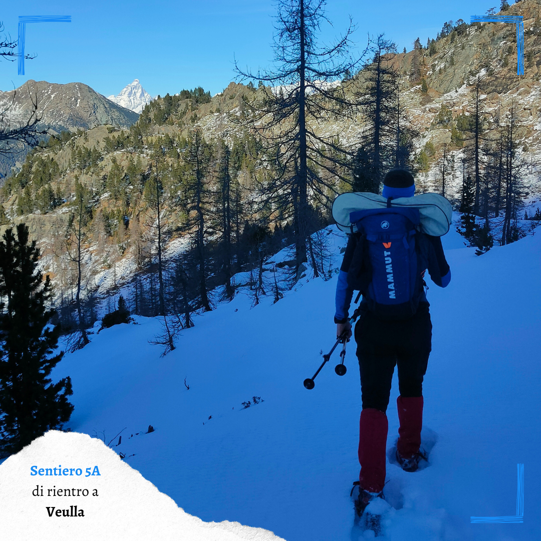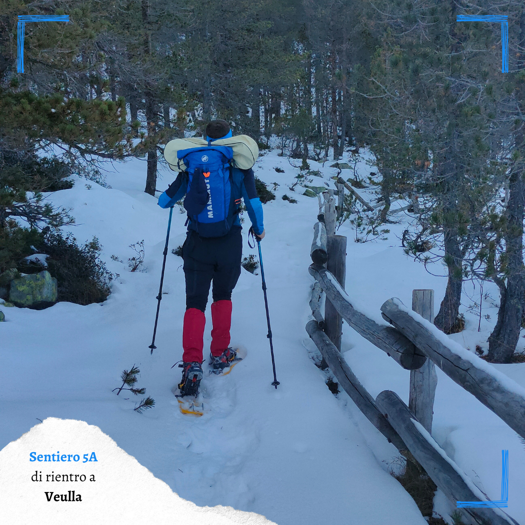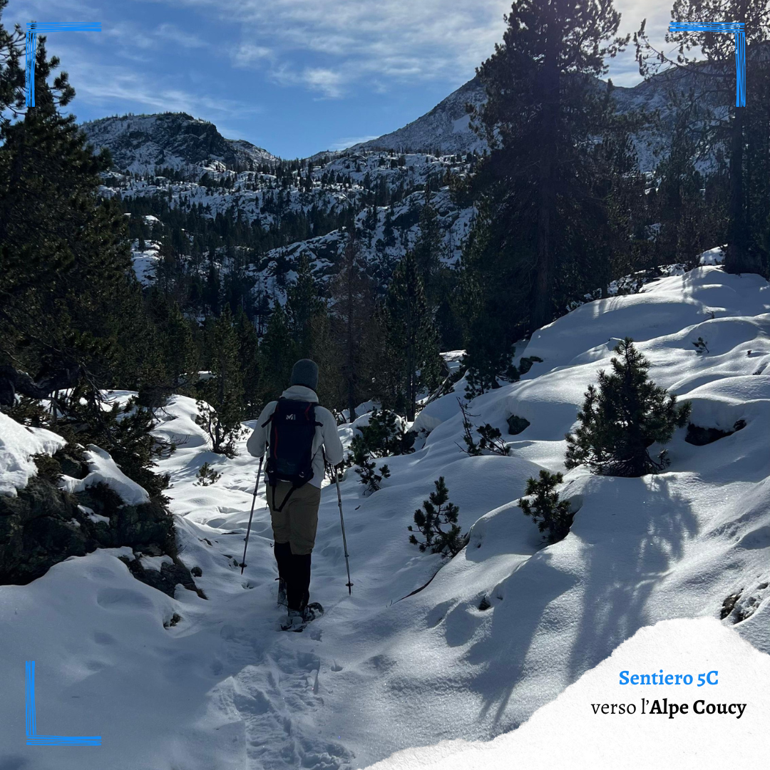 Ci si trova catapultati in un bosco innevato e silenzioso, lontano da piste battute, dove cascate ghiacciate e scorci sulle cime valdostane offrono continui sfondi per spettacolari fotografie.